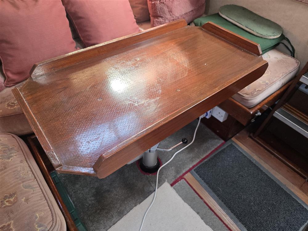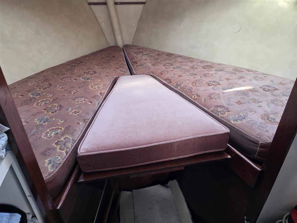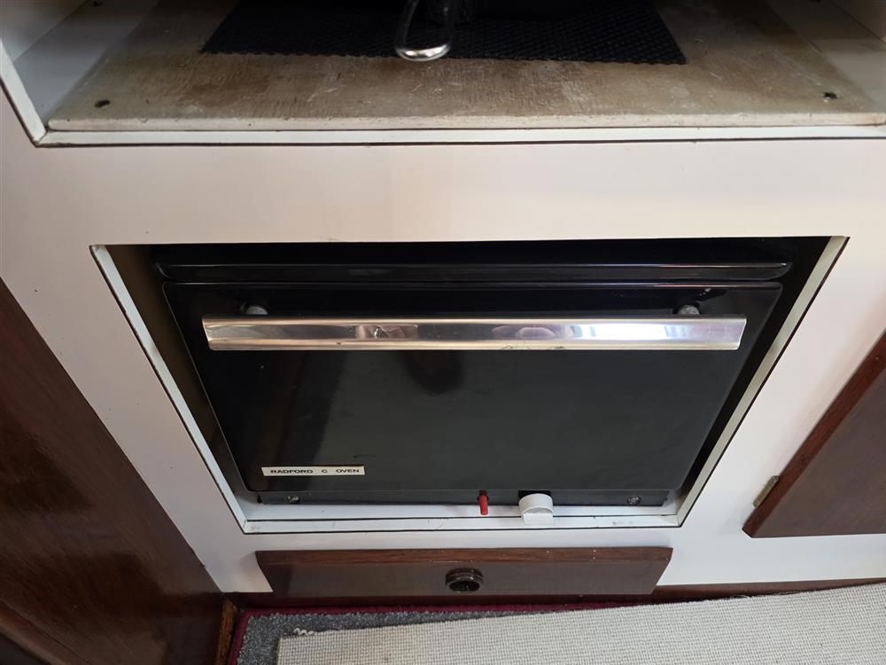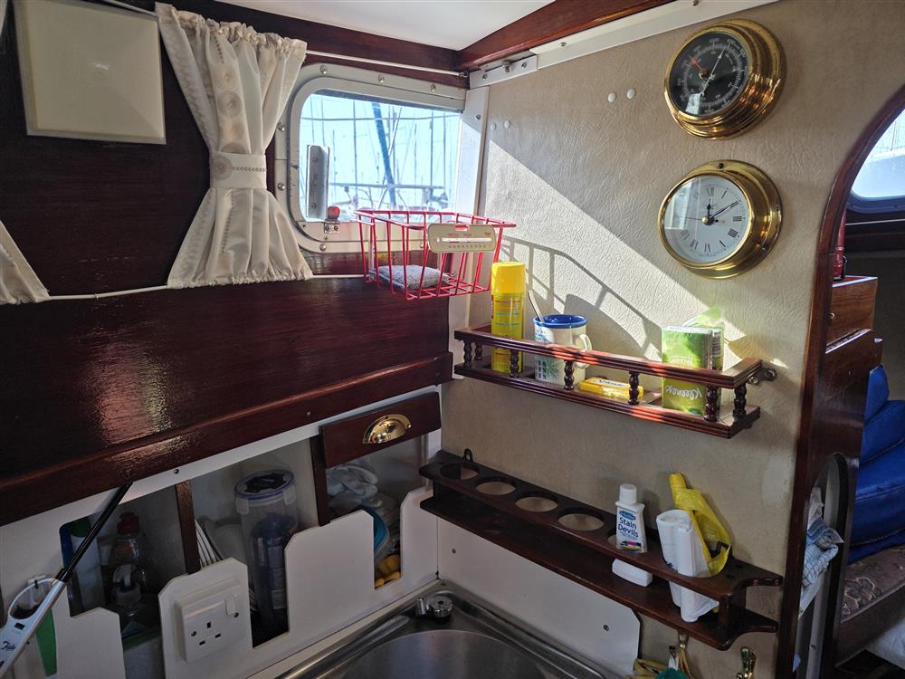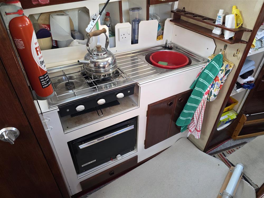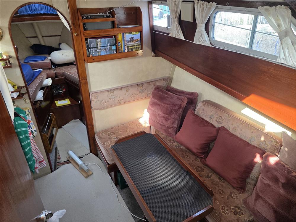 Fore cabin with twin berths (convertible to double), U-shaped saloon seating converting to double berth, galley with two-burner hob & oven, and marine toilet (renewed 2016).