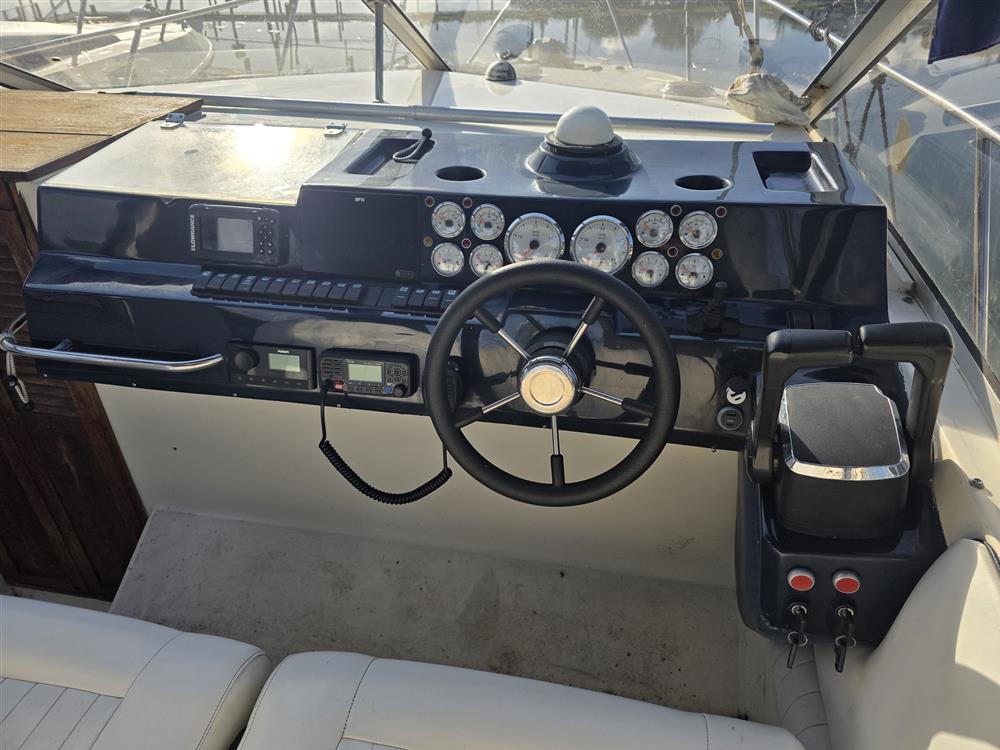 She benefits from a Side-Power bow thruster for effortless manoeuvring, modern navigation systems, and synthetic teak decking throughout the cockpit and bathing platform, combining vintage Sunseeker elegance with practical upgrades.