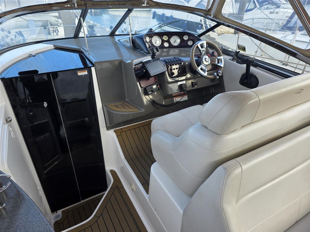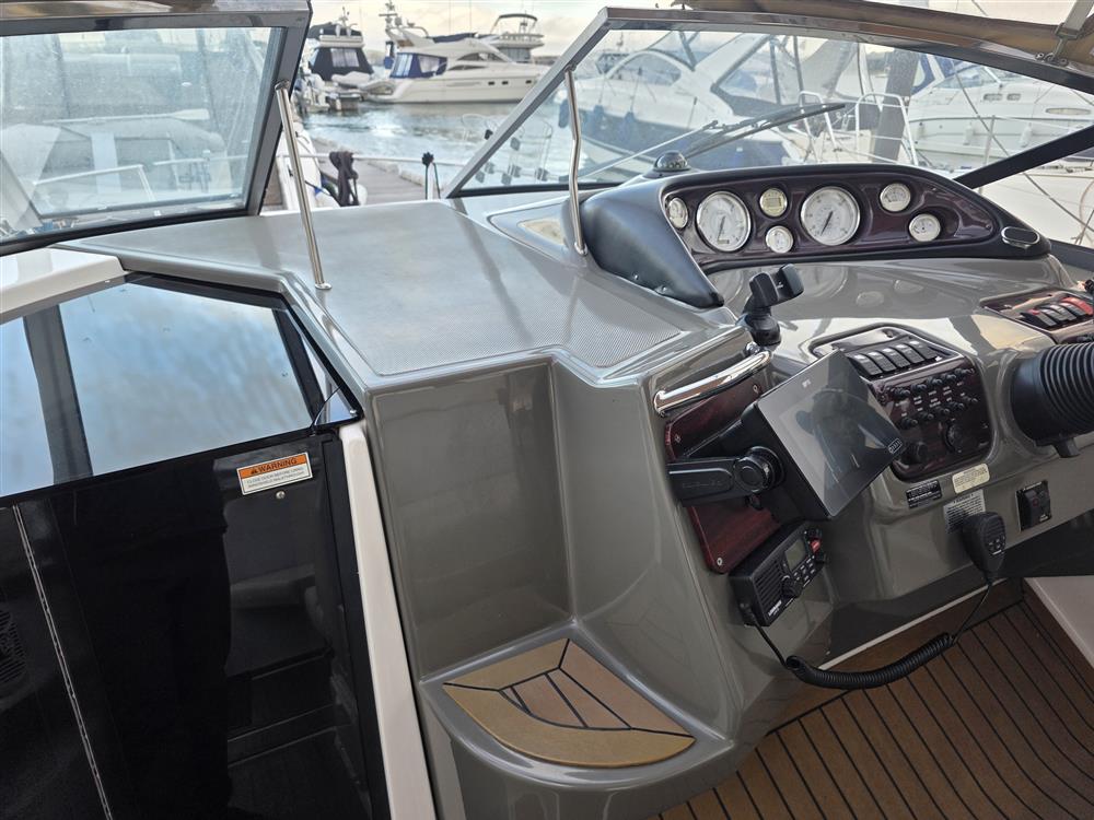 She also benefits from a Side-Power bow thruster for effortless manoeuvring, synthetic teak decking throughout the cockpit and bathing platform, inverter, air conditioning, and heating for year-round comfort.