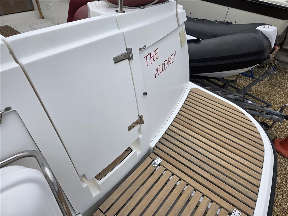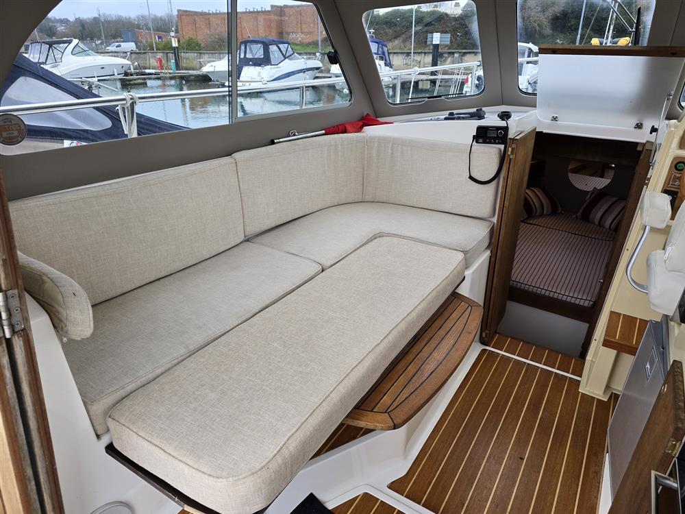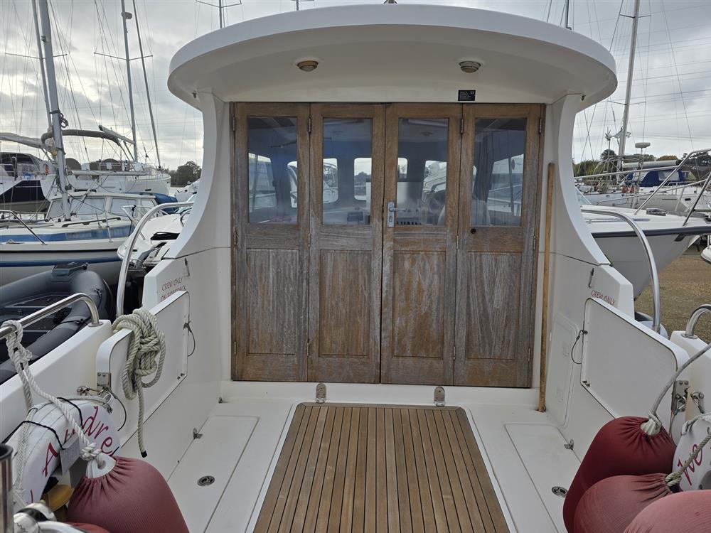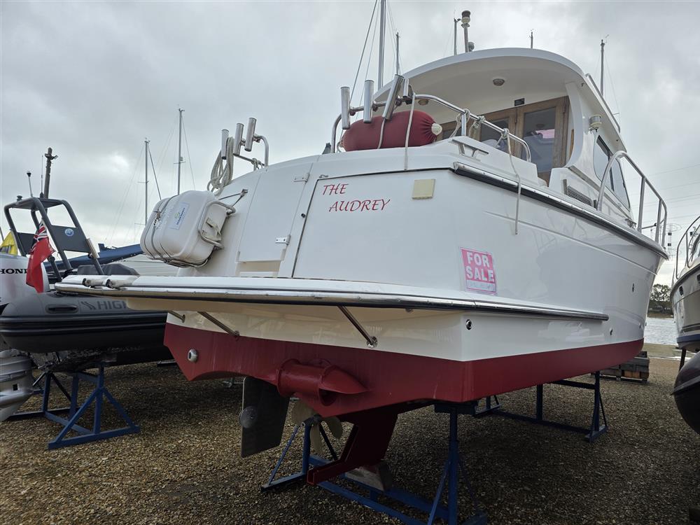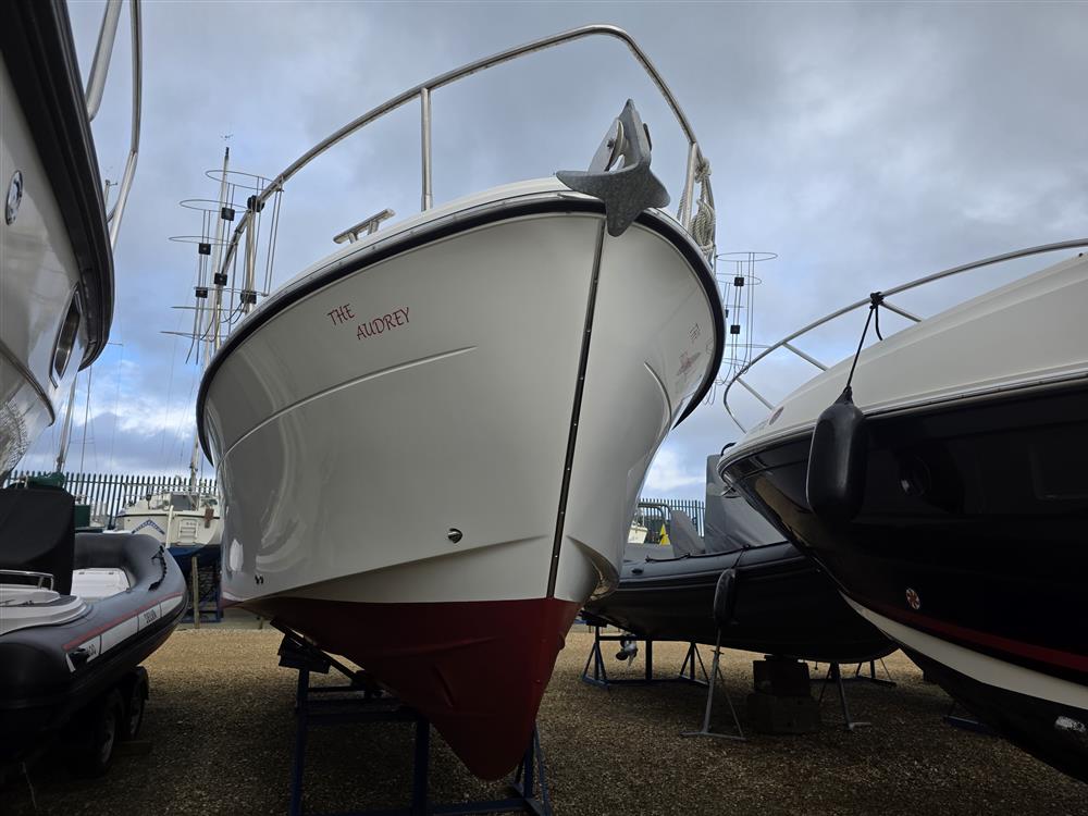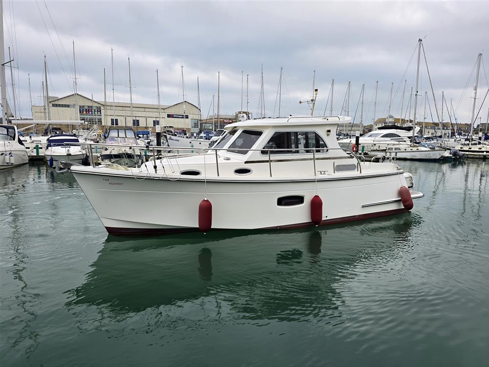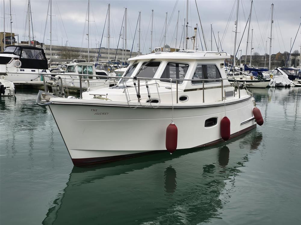 Origin Yachts presents "The Audrey," a Jersey 30 pilothouse motor cruiser designed for steady performance and spacious living. Powered by a Vetus 250 diesel engine (250hp, 4-cylinder), she achieves a maximum speed of 15 knots and a cruising speed of 12 knots. Equipped with Vetus bow and stern thrusters for enhanced manoeuvrability, she accommodates six across one double cabin and a convertible saloon. The separate heads feature an electric toilet with a holding tank. Her layout includes a large saloon, a generous cockpit with wide side decks, and teak-laid decking for practical relaxation.