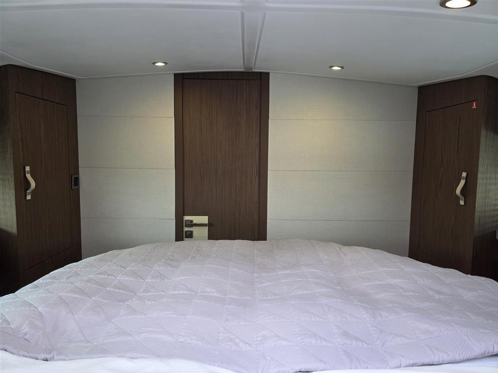 Her cockpit is designed for entertaining and relaxation, featuring a motorised roof, high-low bathing platform, a grill station with wet bar, front sun pad, cockpit table that converts into a sunpad, and a separate integrated cockpit fridge. The helm is centre-positioned, with a double seat for the helmsman and a single seat to starboard, providing excellent visibility and control.