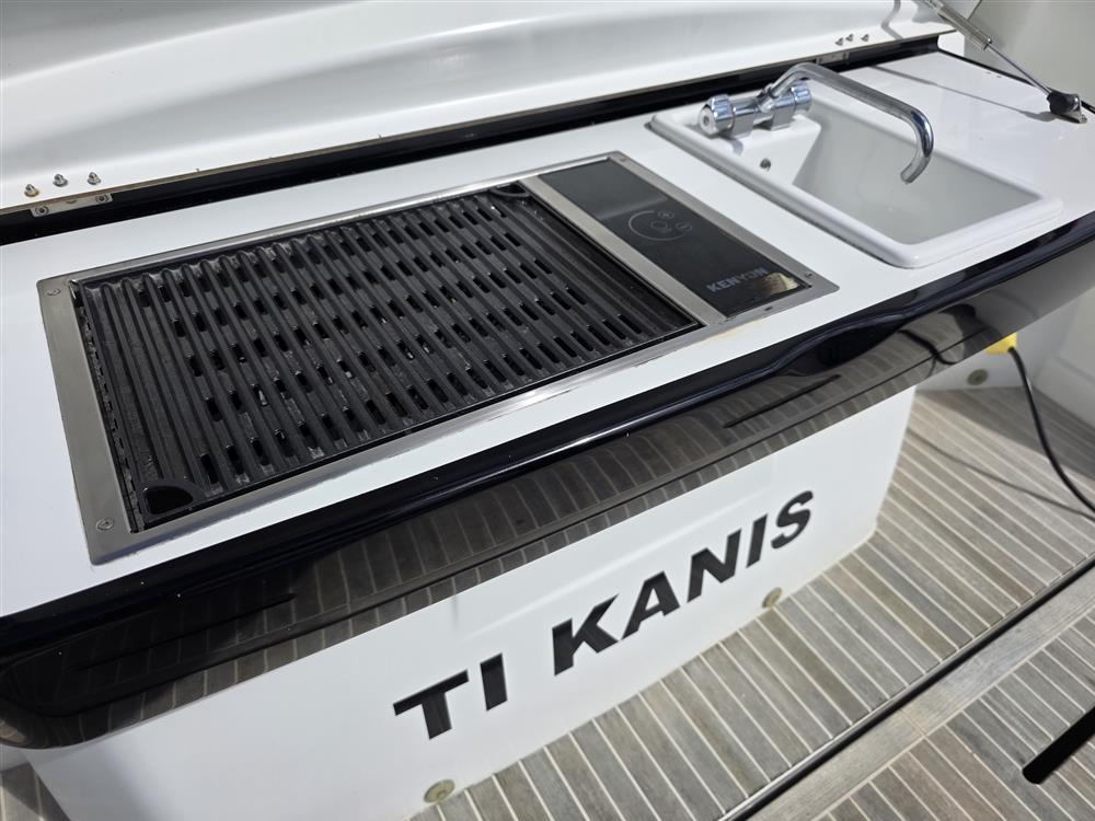 Below deck, TI KANIS accommodates up to six guests in two double cabins, with large heads including a walk-in shower. The interior features Alpi Walnut cabinetry, oak-laminated flooring, and a fully equipped galley. The salon table also converts into a double berth with an infill for additional sleeping flexibility.